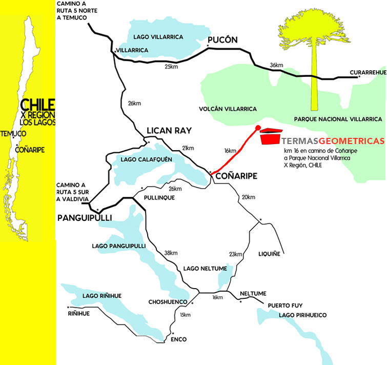Las Termas Geométricas se encuentran en el parque Nacional Villarrica, kilómetro 16 del camino de Coñaripe a Palguín, Región de los Ríos, Chile.