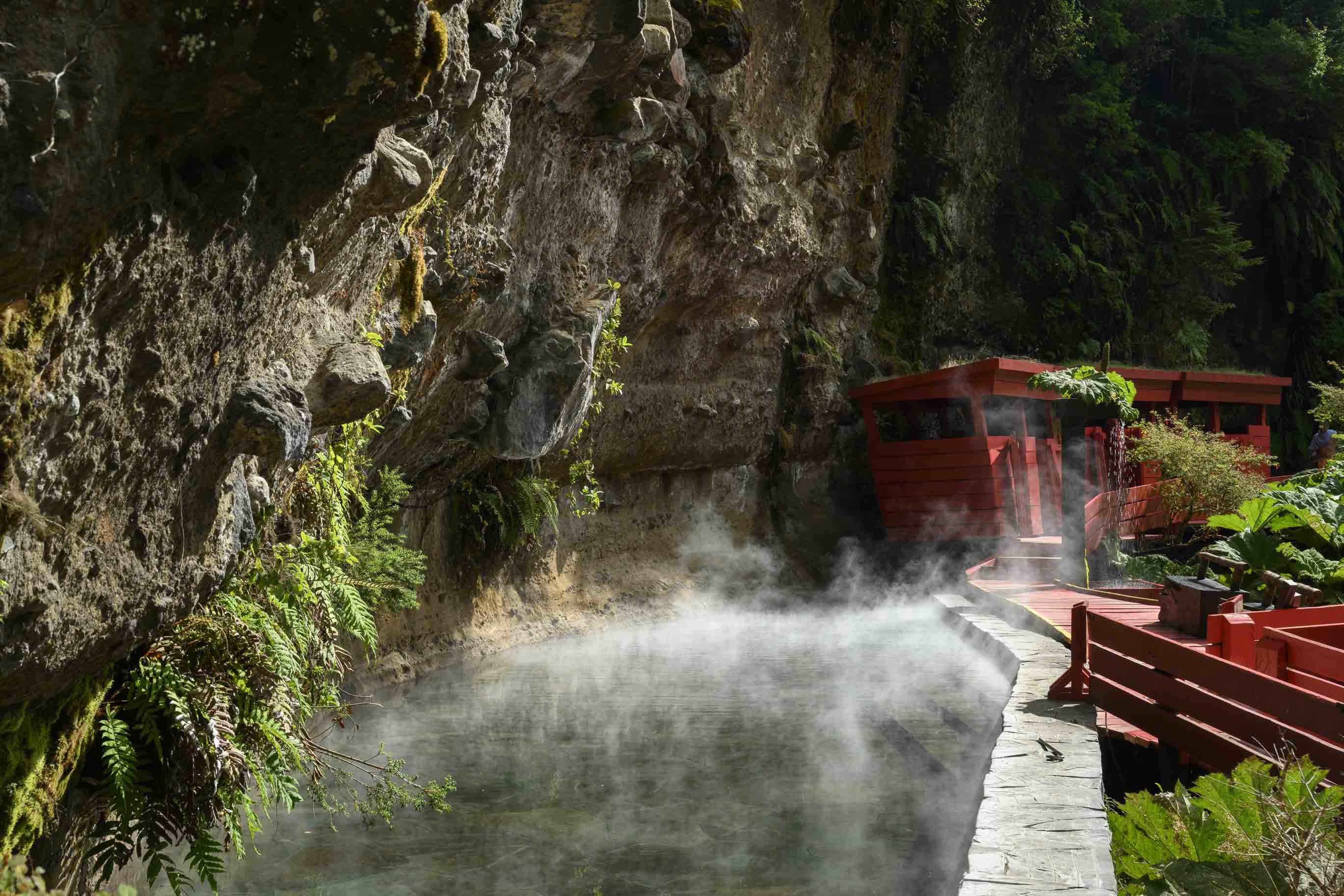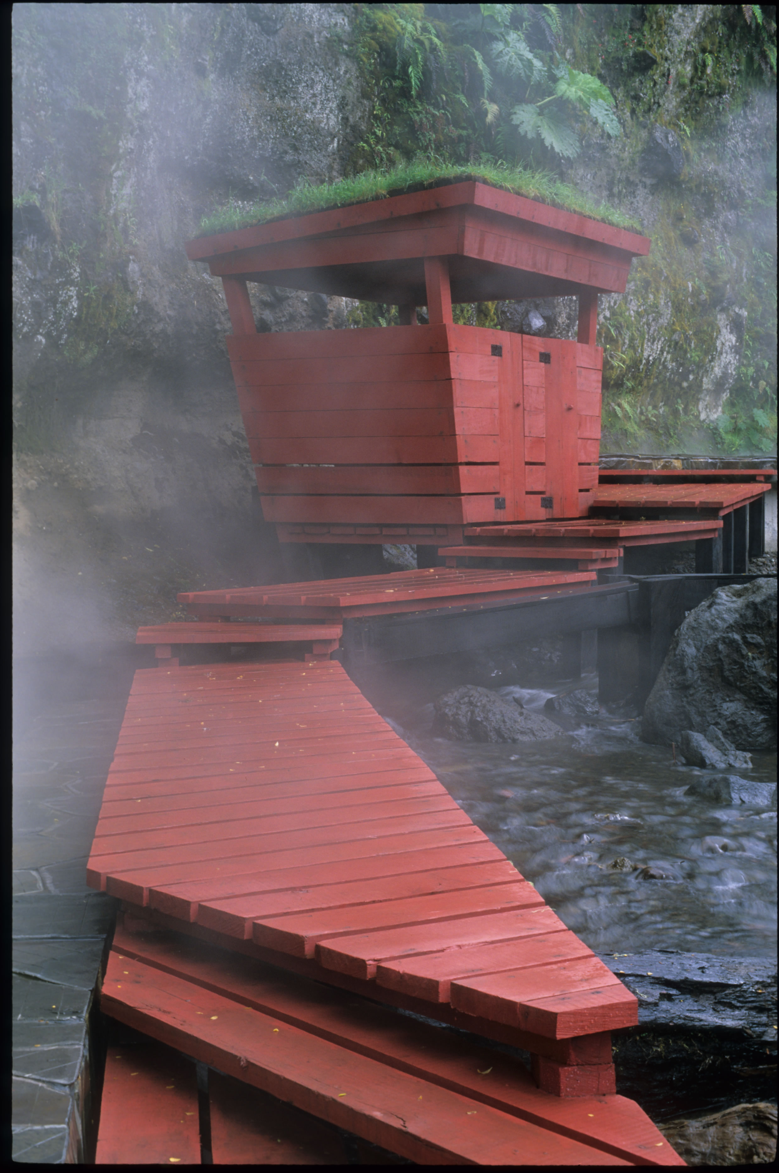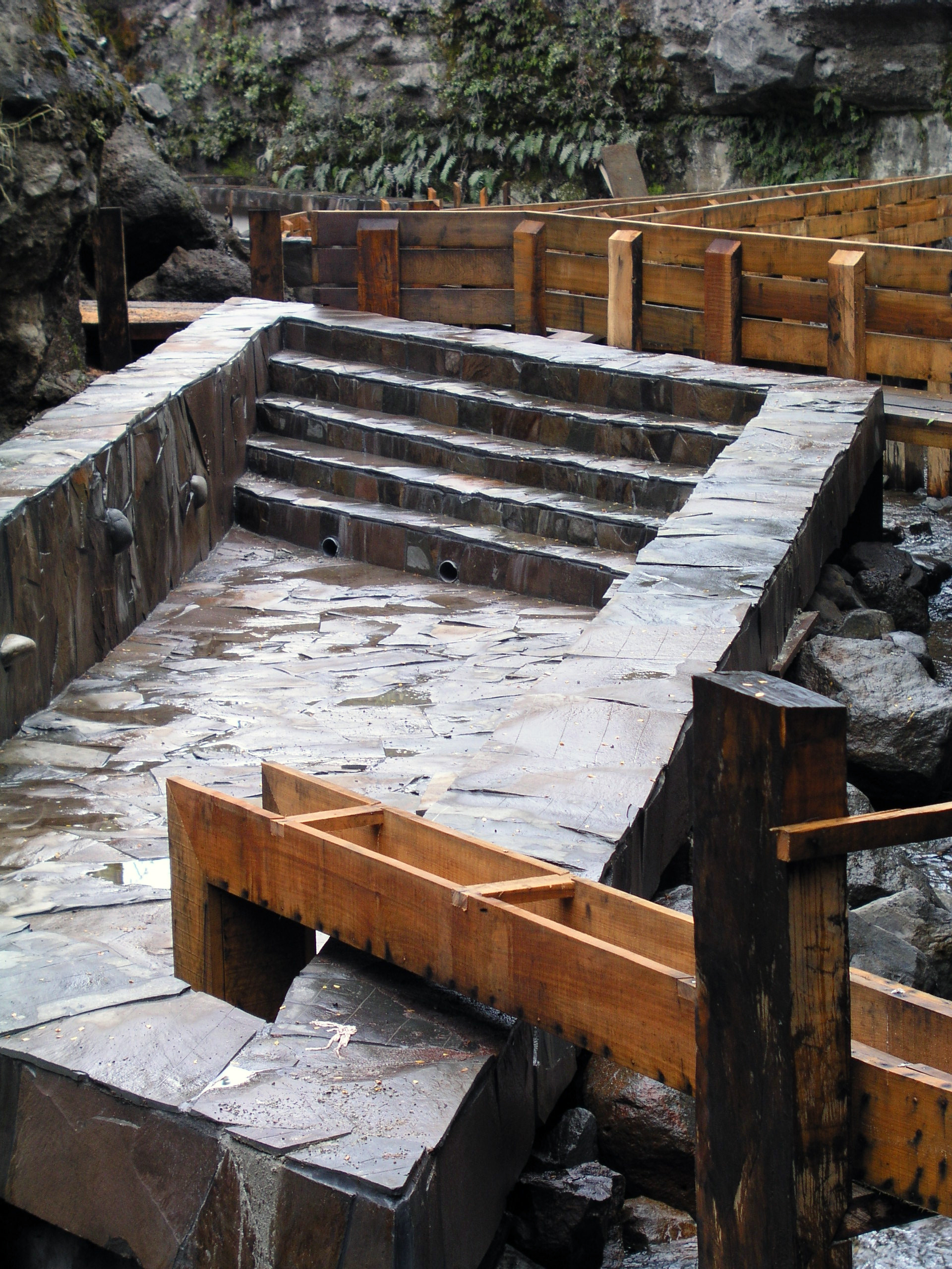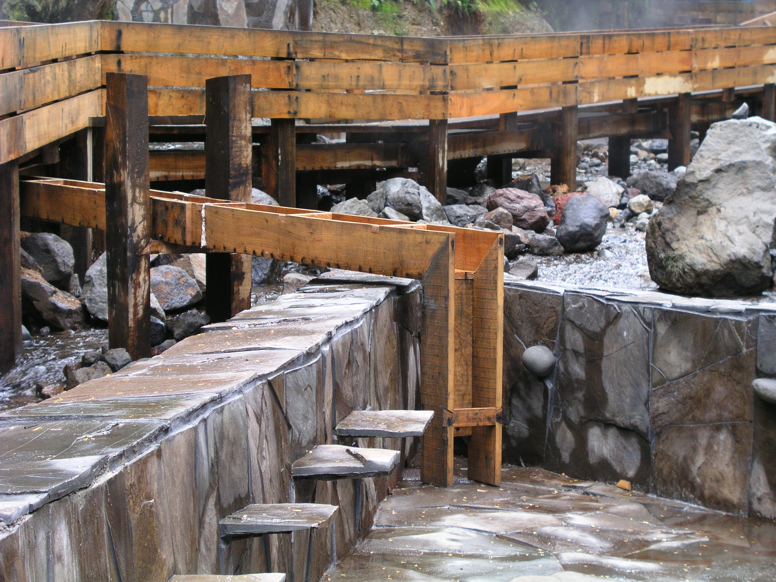 Luego hice construir pasarelas de madera que van por el aire conectando las piscinas entre sí y con los baños, las terrazas, y los camarines, y también con tres cascadas de agua fría, la última y la más alta cae sobre tres piscinas escalonadas, que rebalsan con un estruendo que llama a detenerse y a sentir que el paseo por las termas está cumplido. Como el recorrido de las pasarelas por la quebrada es en pendiente y en zigzag, la vuelta es diferente a la ida. Las pasarelas tienen barandillas forradas en madera sin huecos, y un piso que evita resbalarse para que el paseo sea más o menos seguro.