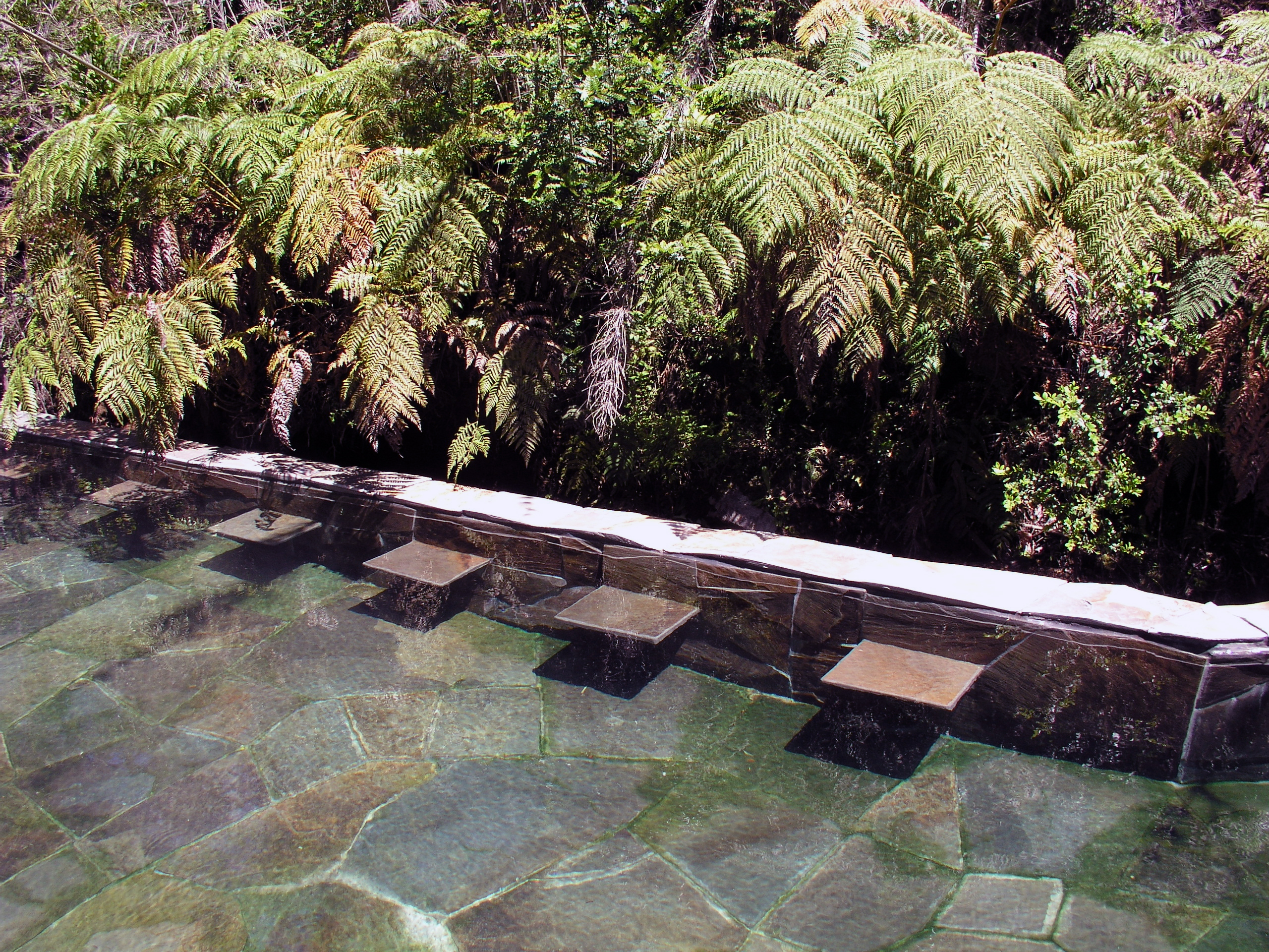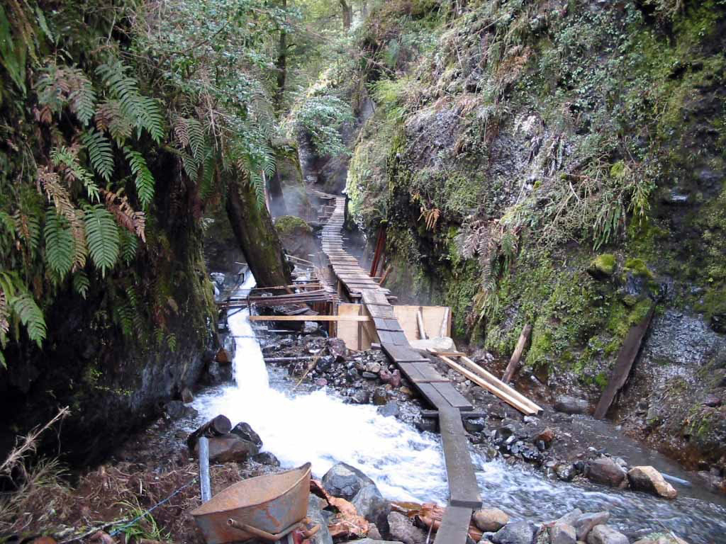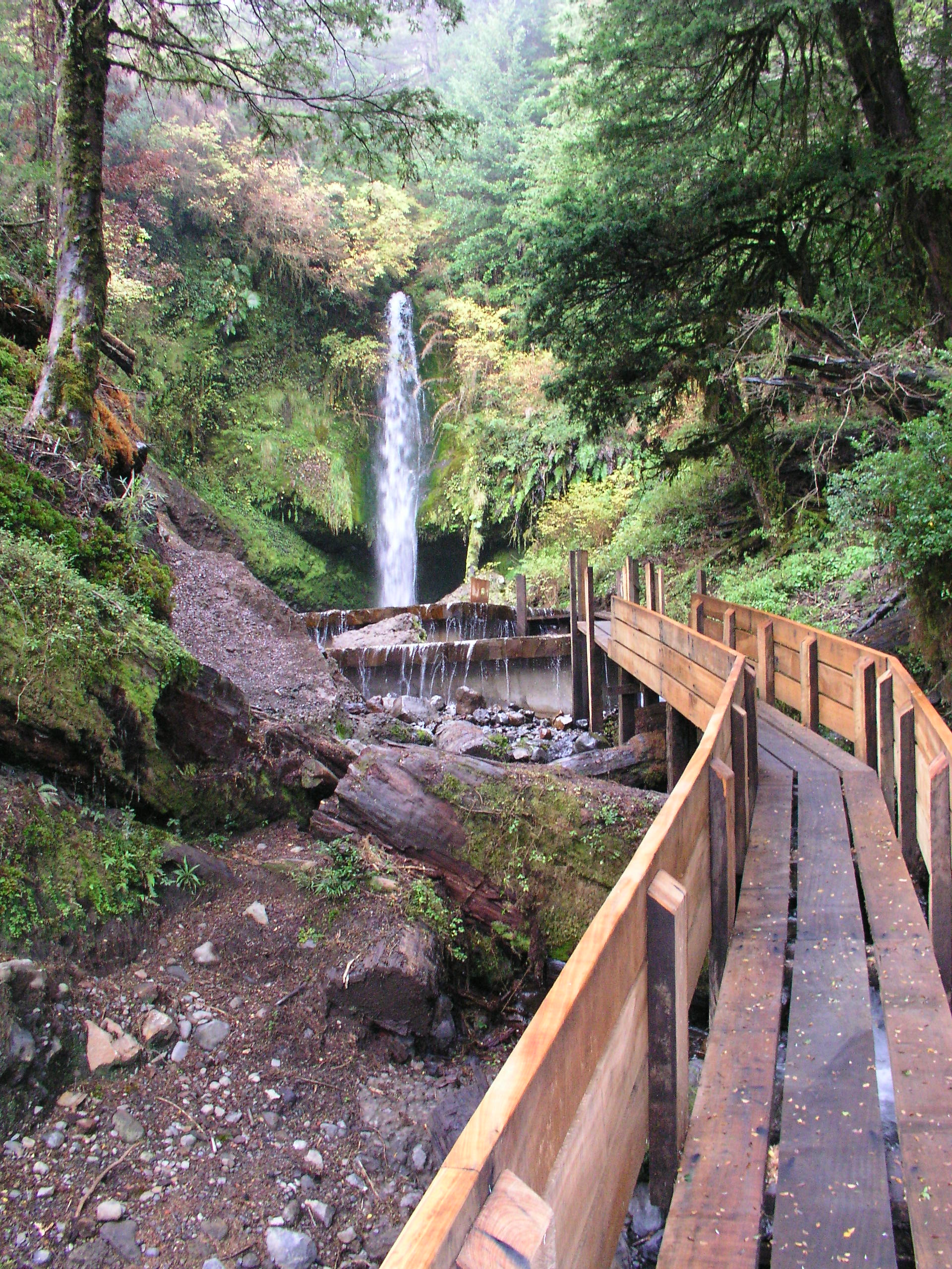 Luego hice construir pasarelas de madera que van por el aire conectando las piscinas entre sí y con los baños, las terrazas, y los camarines, y también con tres cascadas de agua fría, la última y la más alta cae sobre tres piscinas escalonadas, que rebalsan con un estruendo que llama a detenerse y a sentir que el paseo por las termas está cumplido. Como el recorrido de las pasarelas por la quebrada es en pendiente y en zigzag, la vuelta es diferente a la ida. Las pasarelas tienen barandillas forradas en madera sin huecos, y un piso que evita resbalarse para que el paseo sea más o menos seguro.