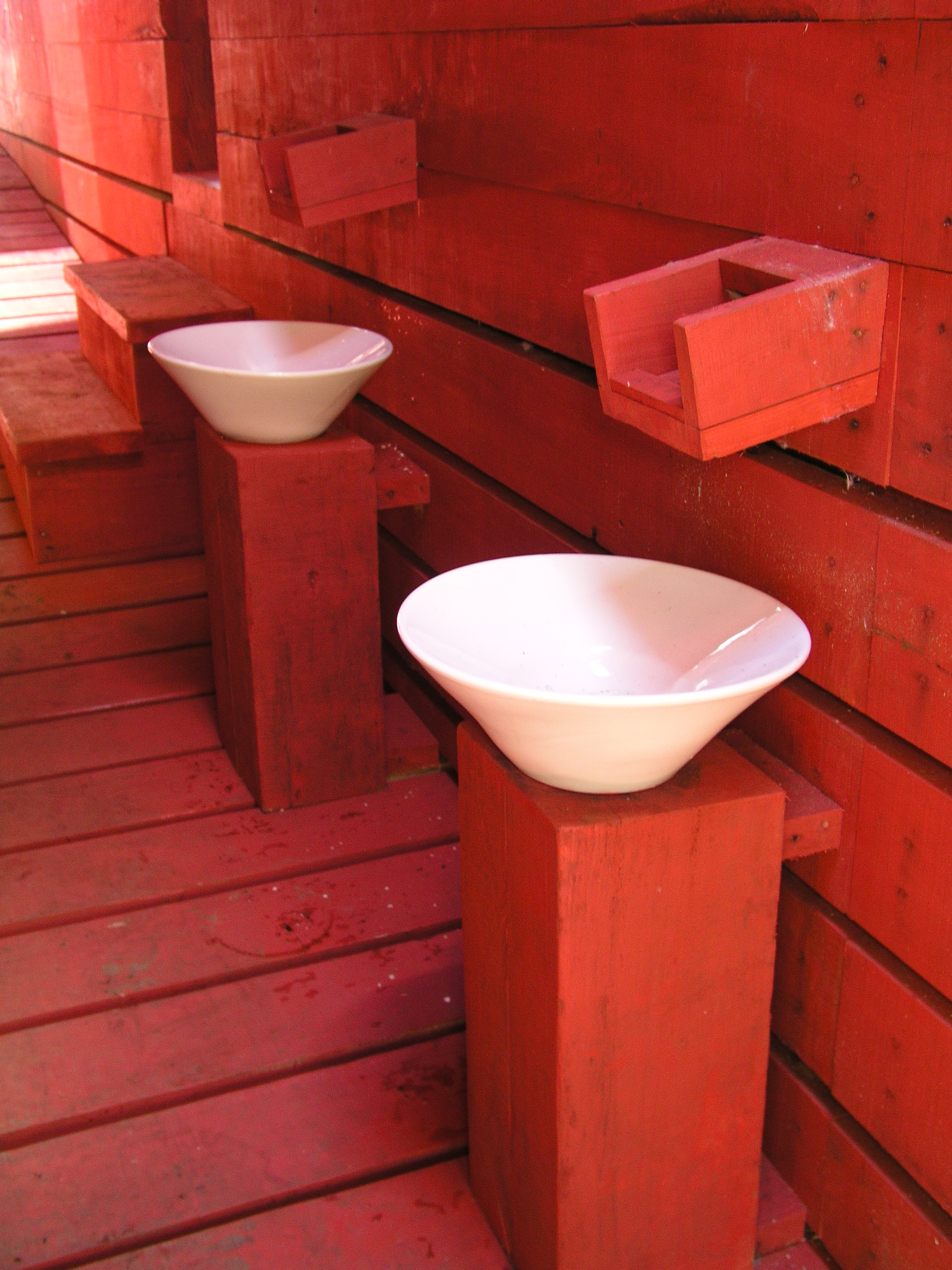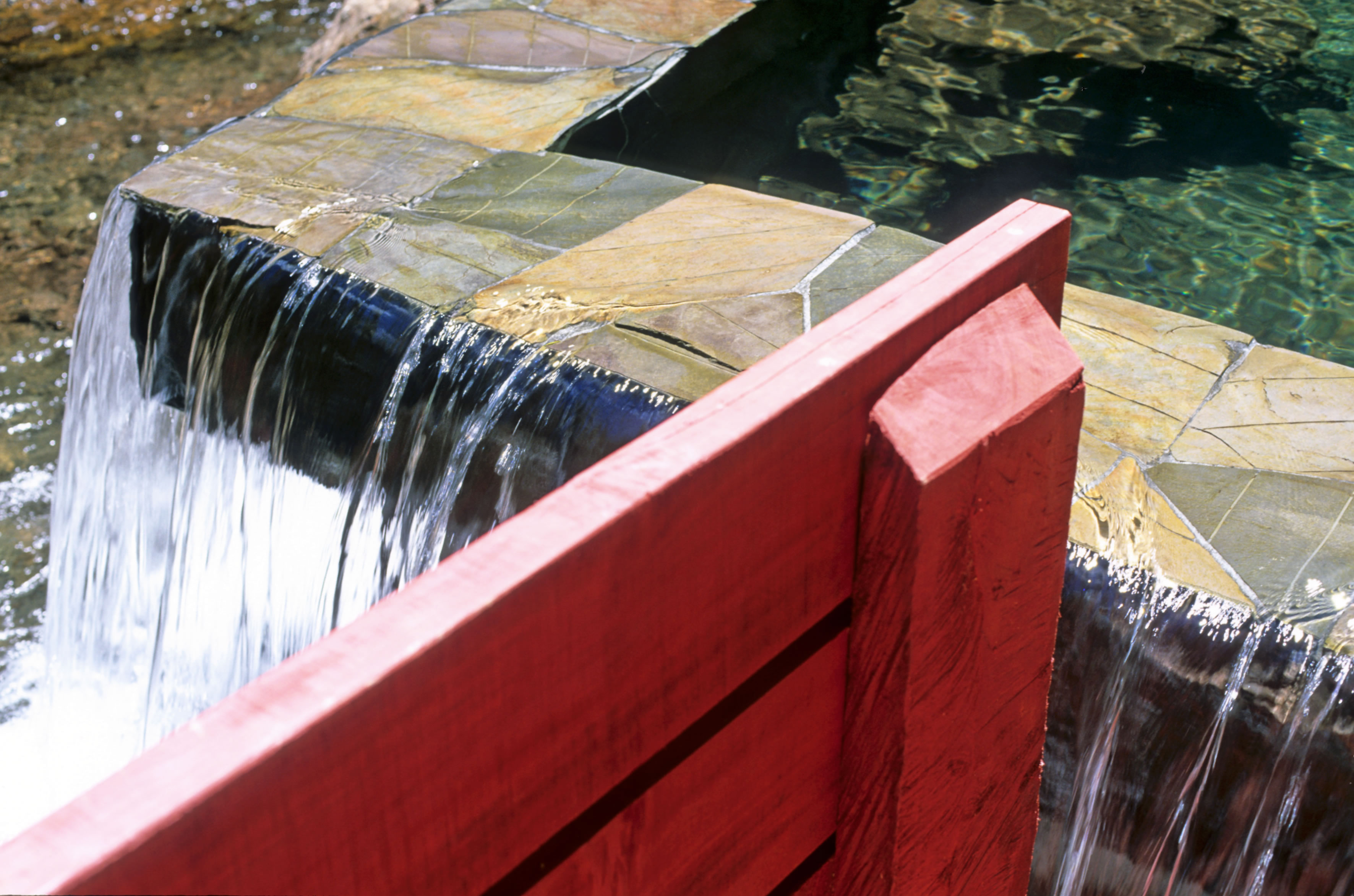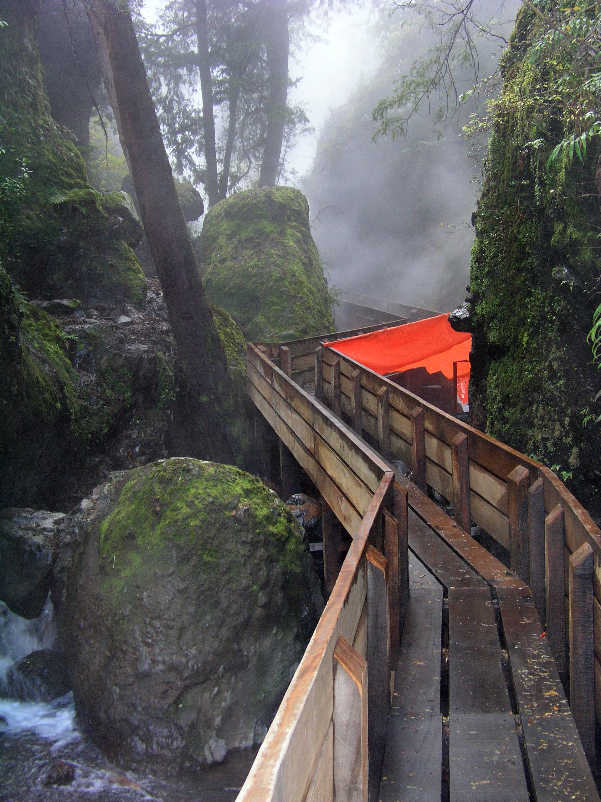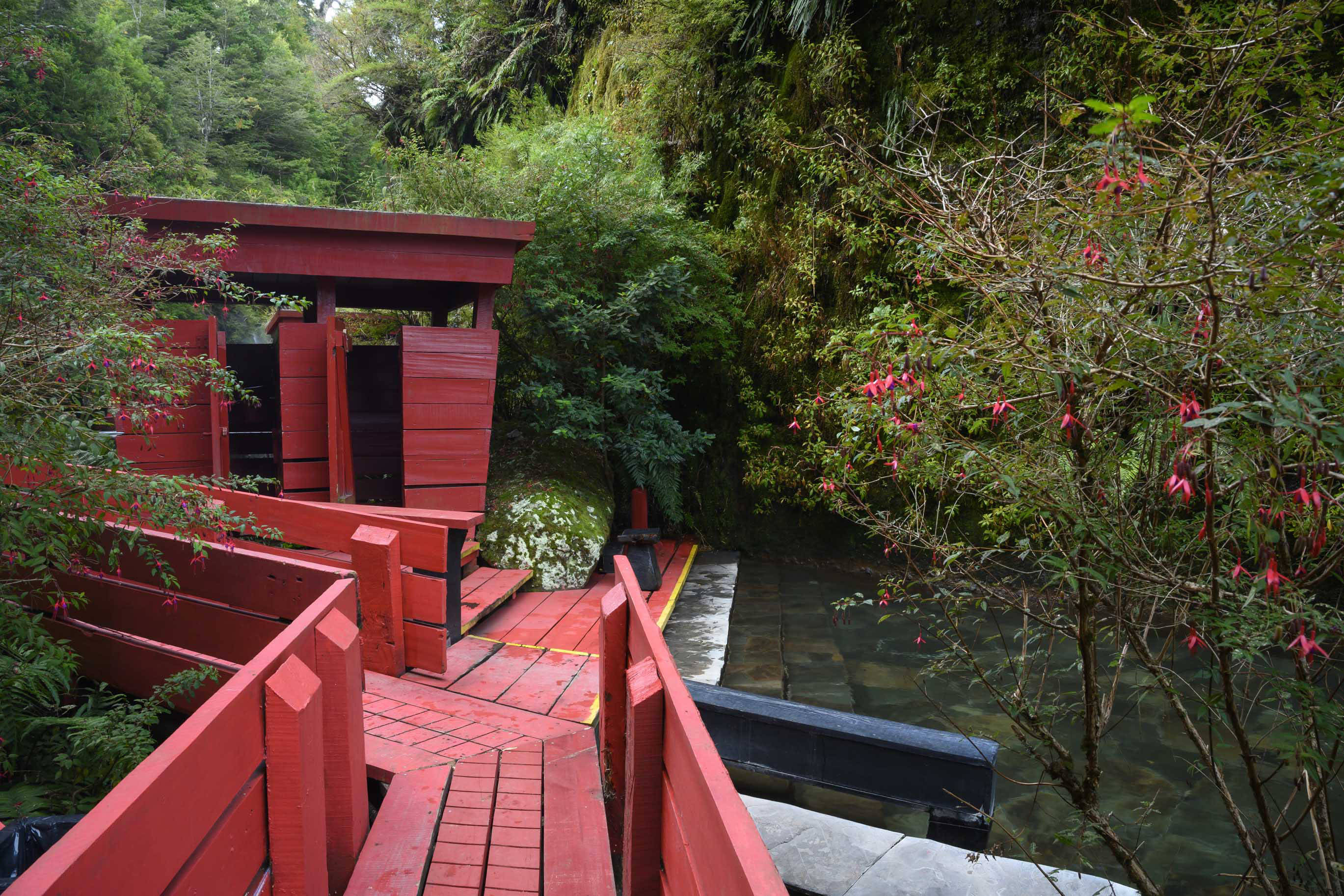 Luego hice construir pasarelas de madera que van por el aire conectando las piscinas entre sí y con los baños, las terrazas, y los camarines, y también con tres cascadas de agua fría, la última y la más alta cae sobre tres piscinas escalonadas, que rebalsan con un estruendo que llama a detenerse y a sentir que el paseo por las termas está cumplido. Como el recorrido de las pasarelas por la quebrada es en pendiente y en zigzag, la vuelta es diferente a la ida. Las pasarelas tienen barandillas forradas en madera sin huecos, y un piso que evita resbalarse para que el paseo sea más o menos seguro.